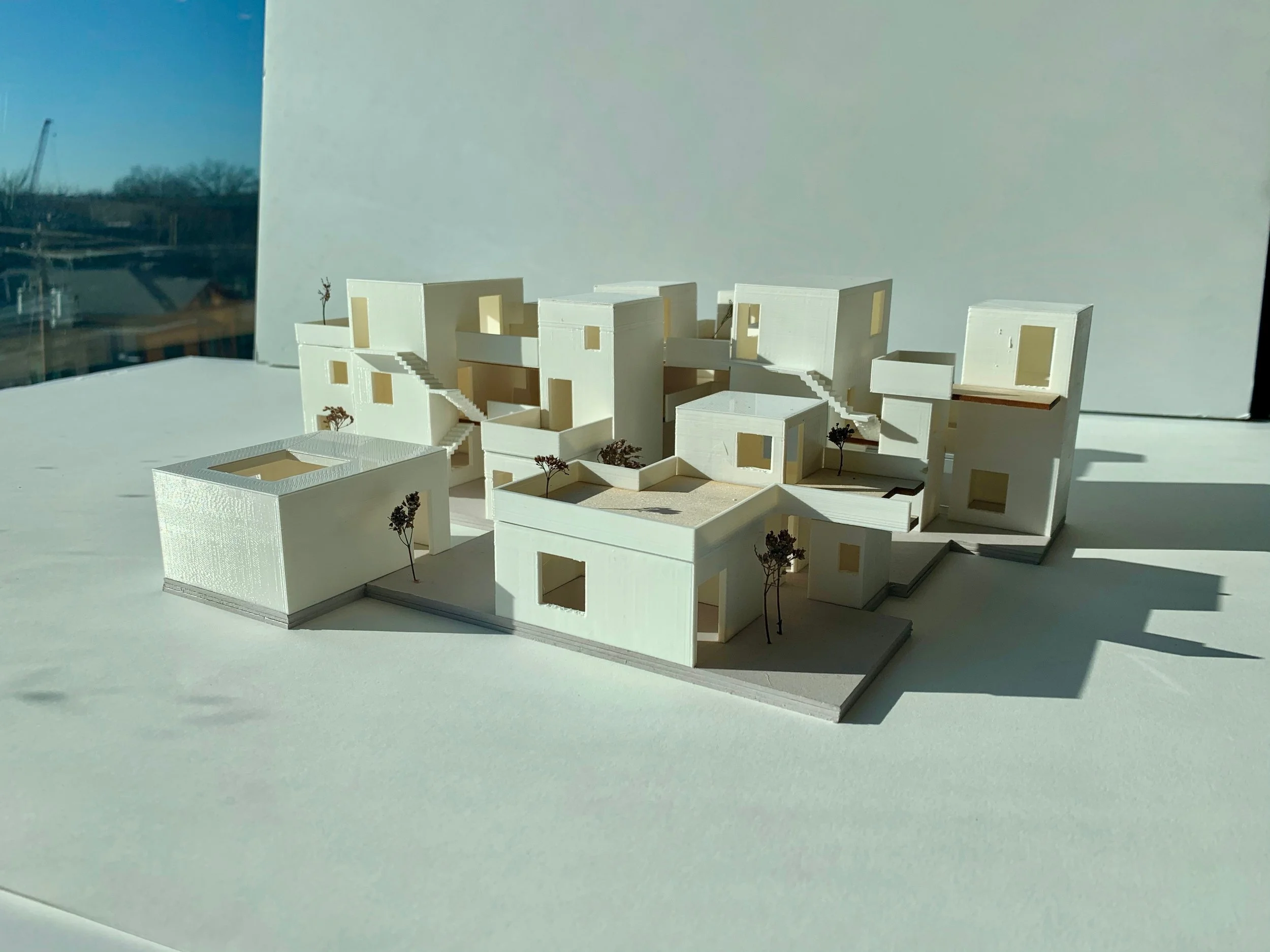 This social housing project sits on top of a hill in the neighborhood of El Laurel in Tijuana, in the center of a homogeneous residential landscape. It proposes to regroup housing units into clusters and separate the different parts of the home into one-to-three story tall volumes of single domestic programs: bathrooms, bedrooms and living spaces. In response to Tijuanans’ predisposition of living outside, outdoor spaces shared amongst neighbors and private patios form between these volumes.